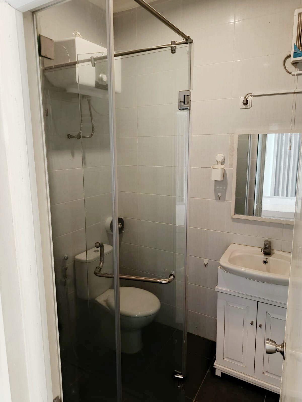 – Kamar Mandi : ada Kaca Tempered Pembatas dan Kabinet di bawah Wastafel
