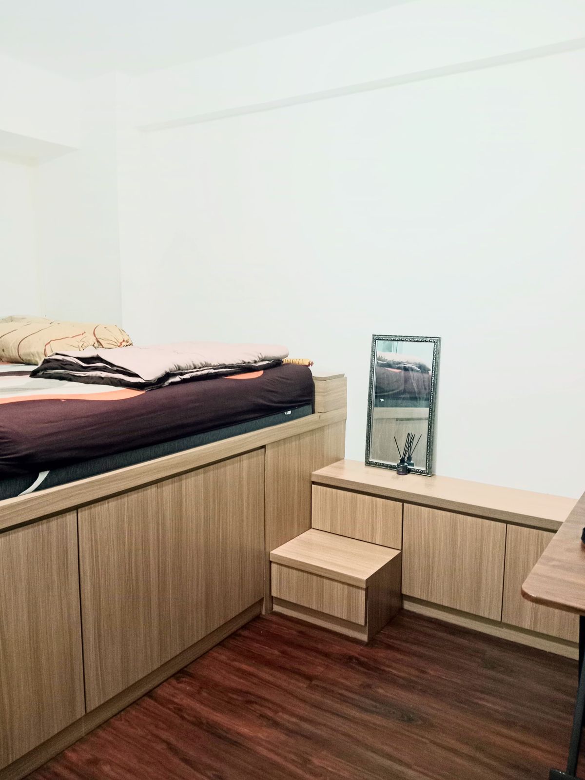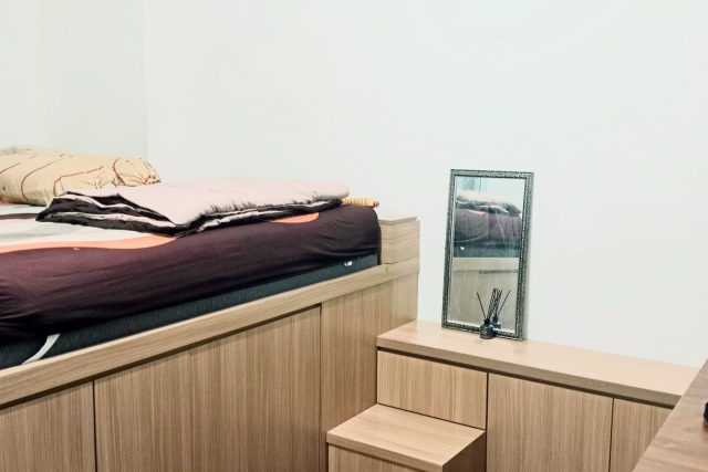 Desain Interior Konsep Japandi, Kasur Queen Bed 160×200, Ac, Storage Pakaian, Kitchen Set + Perlengkapan Dapur, Kulkas