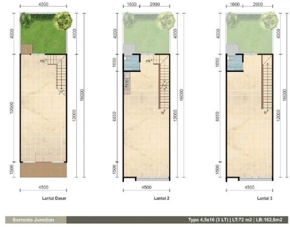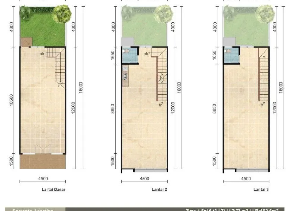 1. LT 72m2 (4.5×16), LB 162m2 | 3 Lantai